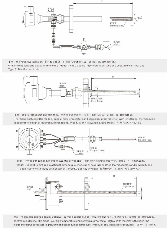 Gas injection thermocouple is an indispensable thermocouple in ammonia plant, increasing servicelife by blowing nitrogen or instrument air to force harmful gas out of thermowell, or preventing entryof harmful media by making the inside thermowell pressure greater than the furnace pressure.